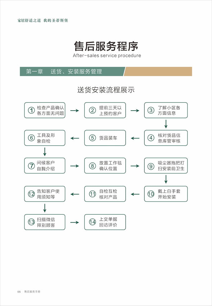 1、根據(jù)約定時間至少提前5分鐘上門,送貨安裝服務人員到達客戶所在小區(qū)或單元時需立即電話或微信通知客戶;