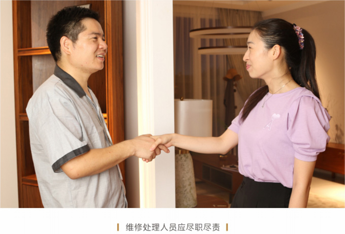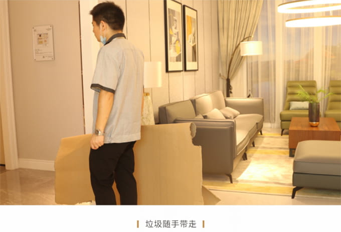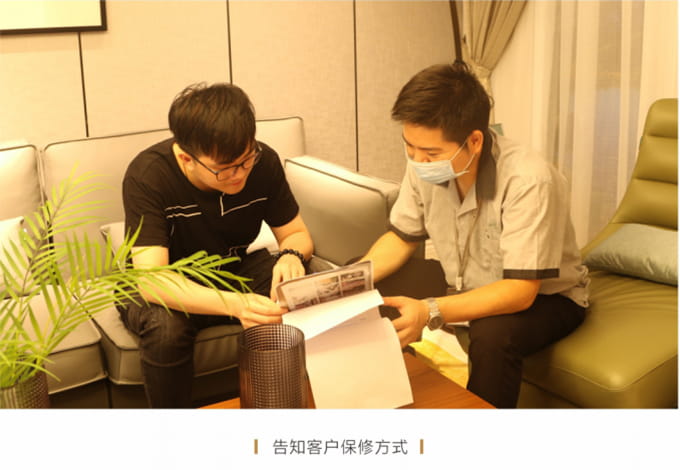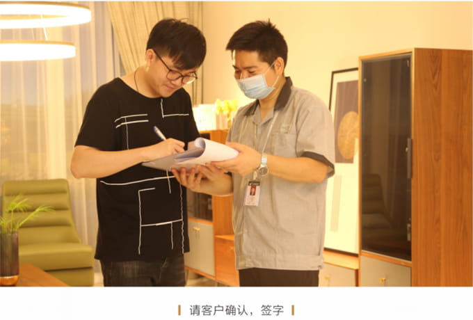 產品處理完畢后必須一站式通檢,指導客戶使用,并將服務過程中產生的垃圾隨手帶走,家具維修完畢后,應用毛巾將家具擦拭一遍,確保產品清潔。