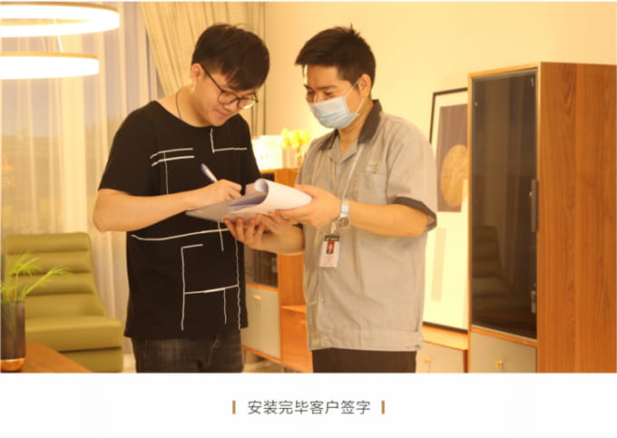 安裝并檢查完所有工作后,需與客戶清點并確認產品,將所有帶電源的家具插上電源,告知客戶家具使用方法和功能及保養(yǎng)知識、注意事項等。所有帶功能的產品需演示給客戶看。例: