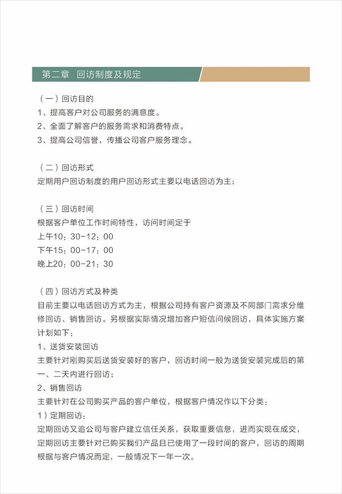 并將有客戶簽名的售后跟蹤單交給店長。店長根據(jù)處理完成結果登記存檔,并對客戶進行回訪,確定售后處理完成,并了解客戶對公司整個服務過程的滿意情況。作為對維修處理人員的考核內容之一。