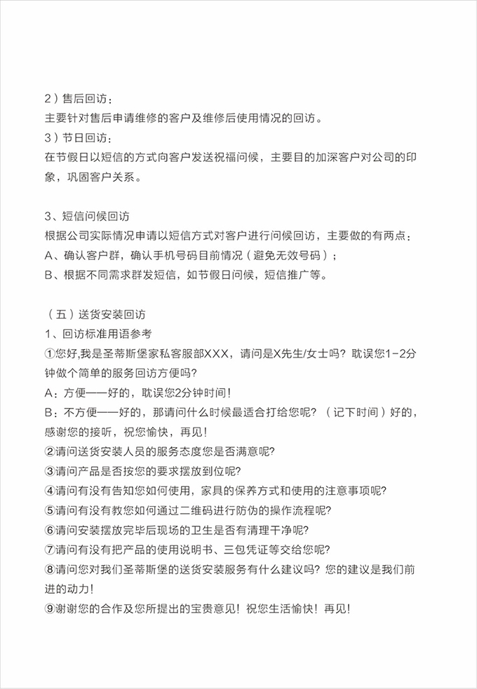 話術參考:“**先生/女士您好,我是PA視訊的售后服務人員**,您購買的PA視訊家具已經全部到貨了,送貨安裝大約需要**時間,請問您這邊什么時候方便我們上門送貨安裝呢?”同時要了解送貨小區(qū)的電梯、樓道、入戶門的尺寸等,提前做好準備,避免意外情況。最后確定送貨時間(安裝所需要時長),并告知客戶安裝人員的相關信息,可加微信發(fā)送,并發(fā)送配送安裝流程說明。
