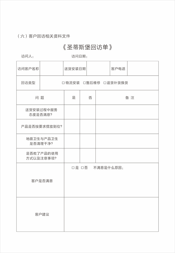 售后人員完成售后,將有客戶簽名的《產品配送單》《配送滿意度調查表》交給店面經理。店面經理根據(jù)處理完成結果登記存檔,并對客戶進行回訪,確定送貨安裝服務完成,并了解客戶對公司整個服務過程的滿意情況。