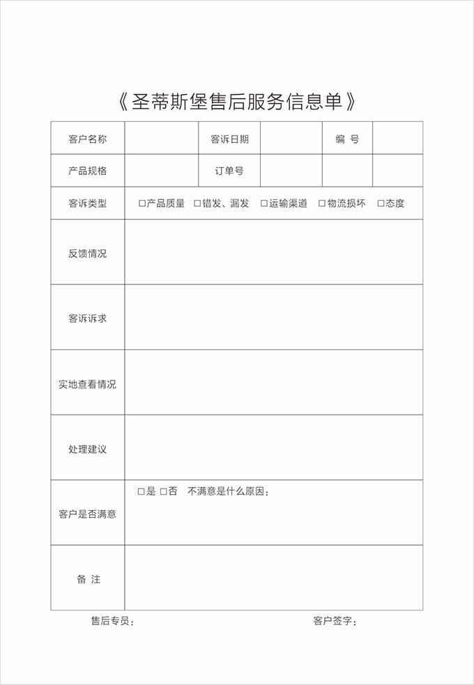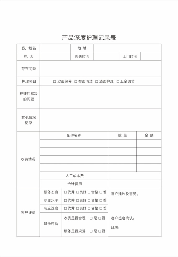 按要求認真填寫服務記錄單據(jù)并請顧客填寫相應內容及簽字,離開顧客處時除了與顧客本人告別外,還需要向有關負責人打招呼,詢問是否還有其他問題,當?shù)玫筋櫩偷臐M意允許后,方可離開。