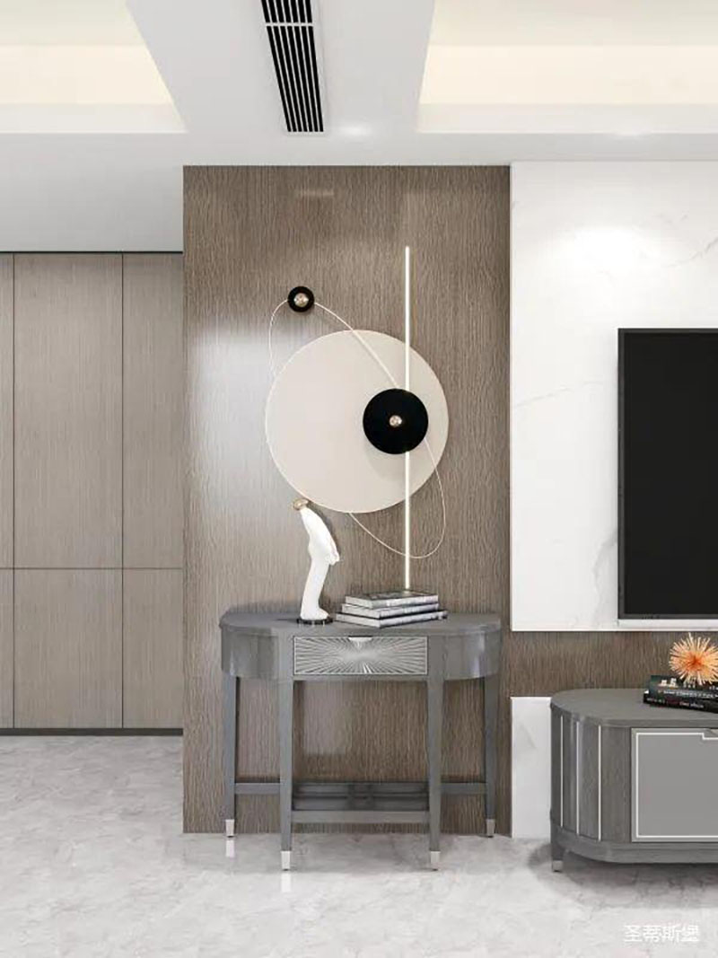 ▲設計師巧妙的運用填充藝術(shù),將客廳電視與沙發(fā)背景色彩相呼應,利用凹凸互補的設計手法,傳遞著空間時尚。莫蘭迪實木家具,配以同色系的高級金屬底座,將精致輕奢從細節(jié)中脫穎而出。