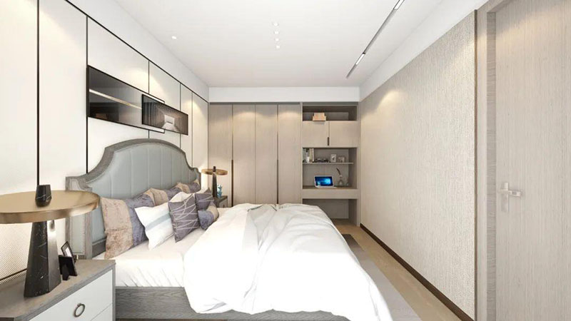 ▲次臥空間主要是以淺色為底調(diào),大面積的莫蘭迪色與淺色相平衡。極強線性裝飾畫帶來的延伸感讓視覺煥然一新。少許的金屬元素攝入,瞬間提升了空間的精致度,將溫潤雅致與時尚輕奢糅合在同一空間里,每一處都洋溢著浪漫的氣息。