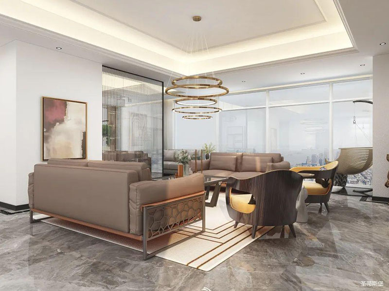 客廳與茶室之間以長虹玻璃隔斷,有效的劃分功能區(qū),為空間展現(xiàn)一番“猶抱琵琶半遮面”的東方意境美。茶室將意式極簡與傳統(tǒng)風(fēng)格糅合,摒棄繁雜、刻板的形式,以含蓄的現(xiàn)代極簡詮釋著東方美學(xué),展現(xiàn)著傳統(tǒng)的待客之道。實木與鎢金金屬質(zhì)感碰撞,有棱有角,高級感頃刻得到了升華。