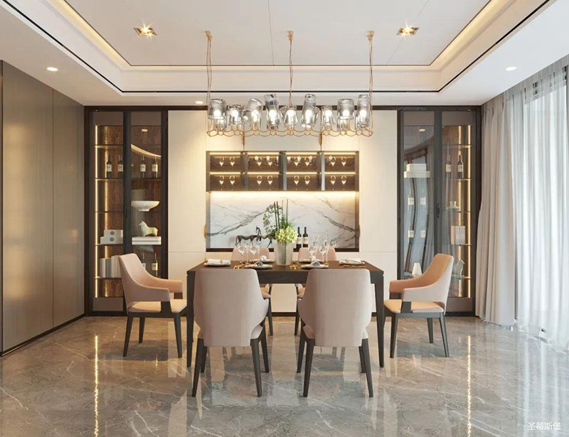 餐廳的裝飾平時都比較簡單,所以對于燈飾的藝術(shù)性與功能性要求較高,主要是追求照明清晰和營造溫馨浪漫的氛圍。一般都是以安裝吊燈為主,聚集餐廳燈光的中心點,安裝在餐桌的正上方,照明和提升美感兩不誤。