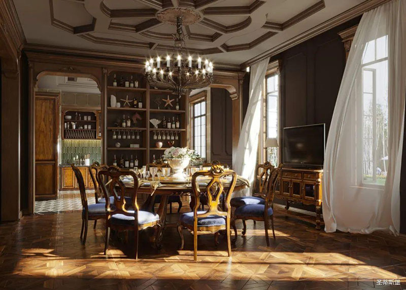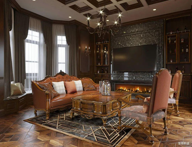 書房護(hù)墻板是由白楓木皮拼接的花鬘圖案,顏色層次分明,立體感超強(qiáng),營造了滿滿的美式鑲嵌藝術(shù)感。深沉木色邊柜在護(hù)墻板上延伸,逐漸浸染了古銅色的家具和燈飾,結(jié)合著拱形羅馬柱,塑造出端雅大方的環(huán)境氛圍。