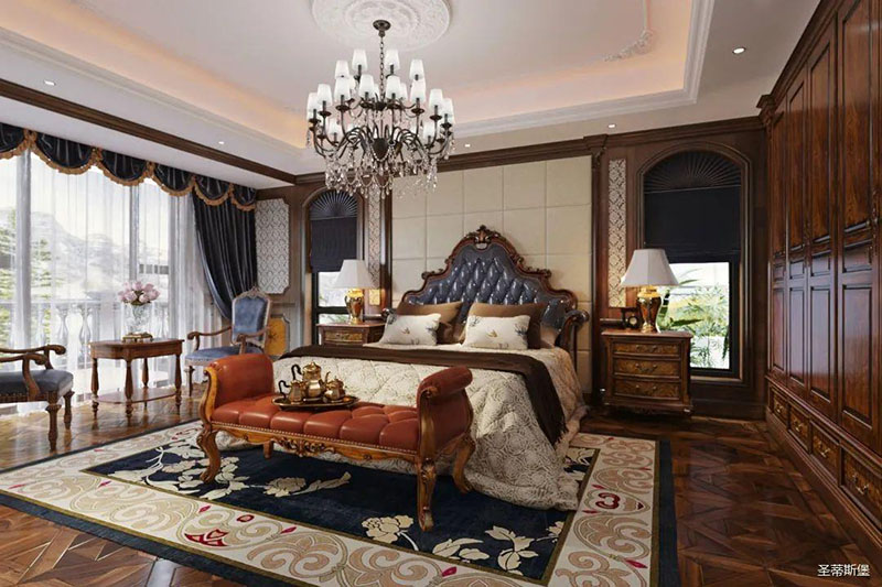 主臥置頂復(fù)古紋理的實木衣柜,在完善了收納的同時,極簡動線也完整了生活的風(fēng)貌。深海藍(lán)的高床屏與米色背景碰撞,猶如海水與沙灘相融,置身其中,仿佛與藍(lán)天碧海來了場浪漫自然的邂逅。地毯上精致的古典鮮花紋理,擷取設(shè)計師的絕妙巧思,與空間的雕花藝術(shù)相呼應(yīng),在居家空間里演繹了一場溫馨的藝術(shù)創(chuàng)作。