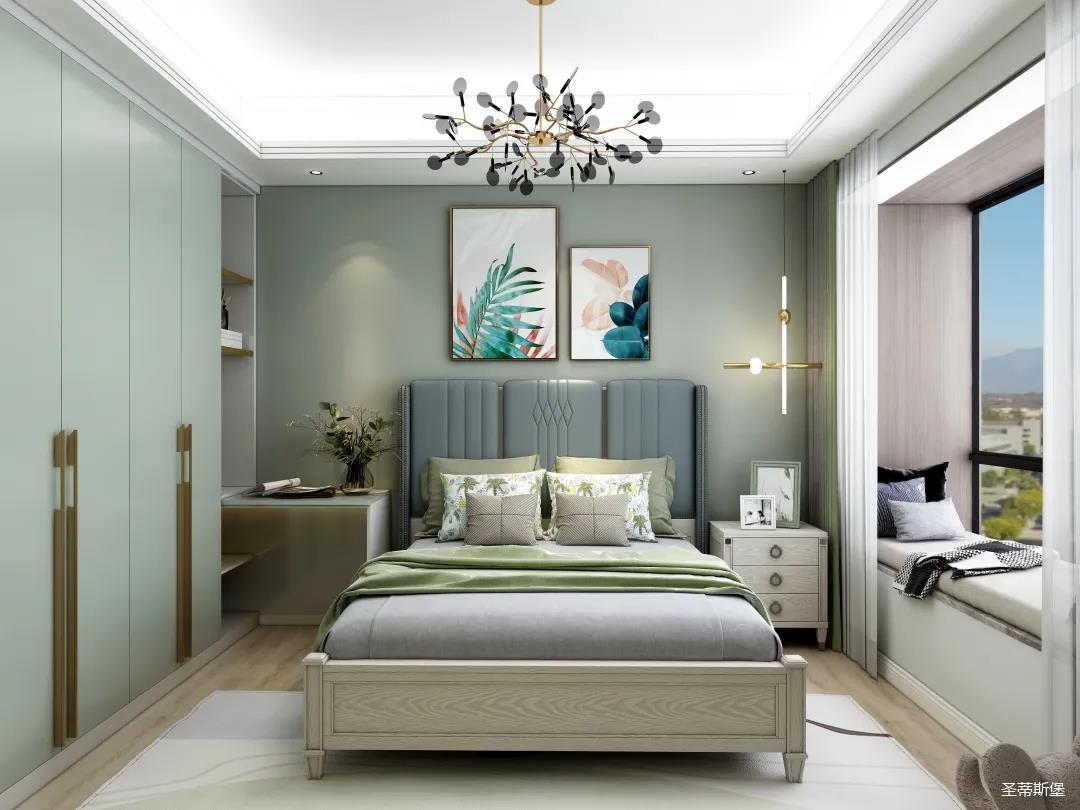 次臥的設(shè)計(jì)充滿治愈氣息,表姐打算讓兩位老人居住。莫蘭迪灰的實(shí)木感經(jīng)典再現(xiàn),沉穩(wěn)中透著時(shí)尚,流露出精致的美式格調(diào)。舍棄刻意繁復(fù)的設(shè)計(jì),簡(jiǎn)約米白背景墻與床屏產(chǎn)生的視覺延伸,提升了空間的舒展性。金屬材質(zhì)的燈飾,以較強(qiáng)的白熾燈為主,輔助照明,將對(duì)兩位老人的關(guān)愛體現(xiàn)在細(xì)節(jié)中。