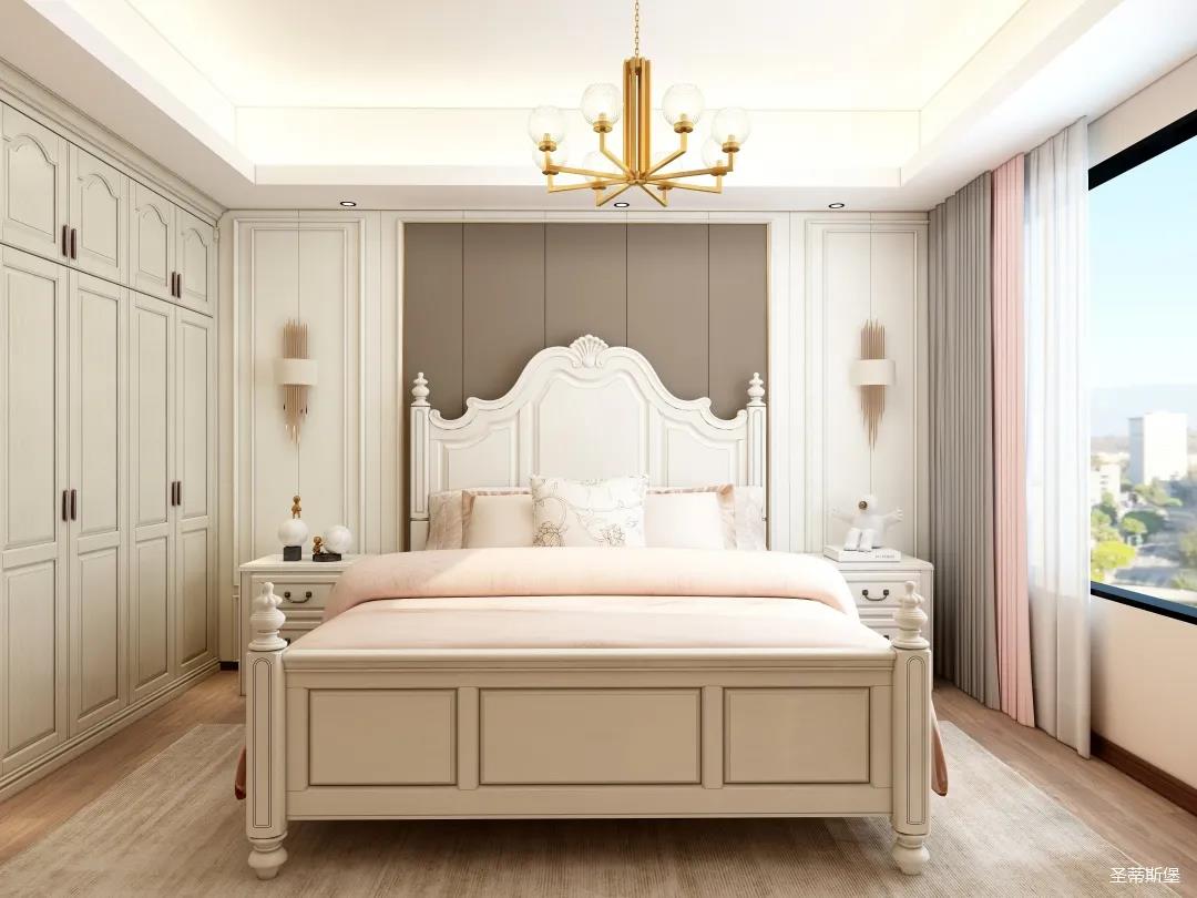 次臥的設(shè)計(jì)更注重收納,人性化嵌入式書(shū)桌,整排衣柜設(shè)計(jì)有效的利用了空間每一個(gè)角落。床屏在保持原有美式家具特色的同時(shí),增加了線條美,將繁雜的雕琢簡(jiǎn)化,并融入時(shí)尚的美式元素,壁燈,吊燈糅合自然光影,完美呈現(xiàn)出尊貴的空間格調(diào)。