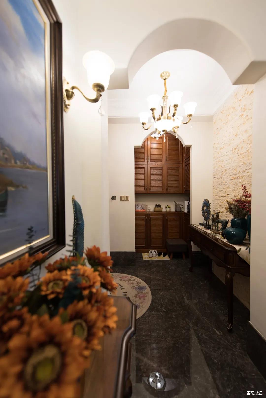 入戶玄關(guān)雙開(kāi)門(mén)設(shè)計(jì),儀式感滿滿!地面定制的瓷磚貼花設(shè)計(jì),典雅又大方。核桃實(shí)木玄關(guān)桌,加上精致的擺件,經(jīng)典美式復(fù)古吊燈,不著痕跡的展現(xiàn)出居者對(duì)生活的激情,魅力吸睛,從入戶開(kāi)始感受古典氛圍。