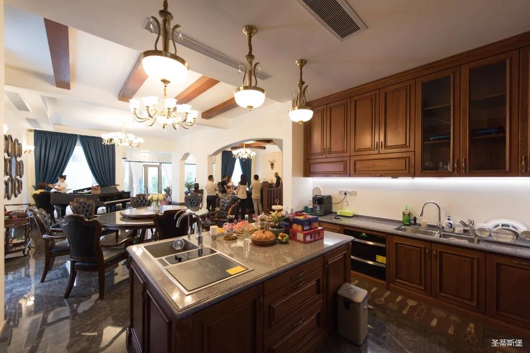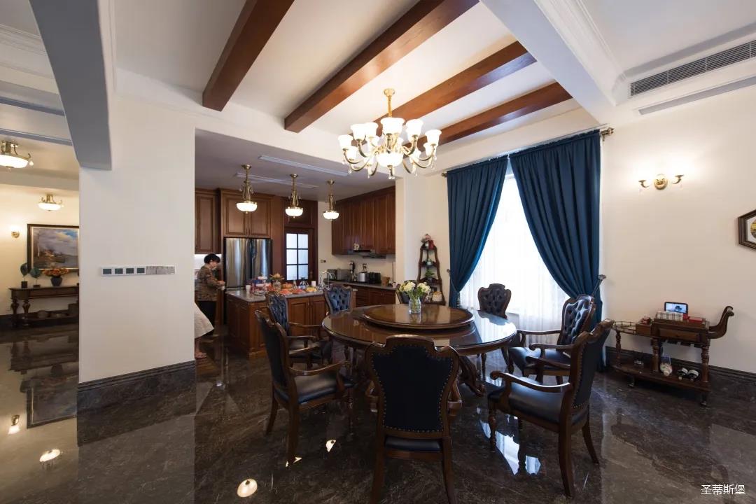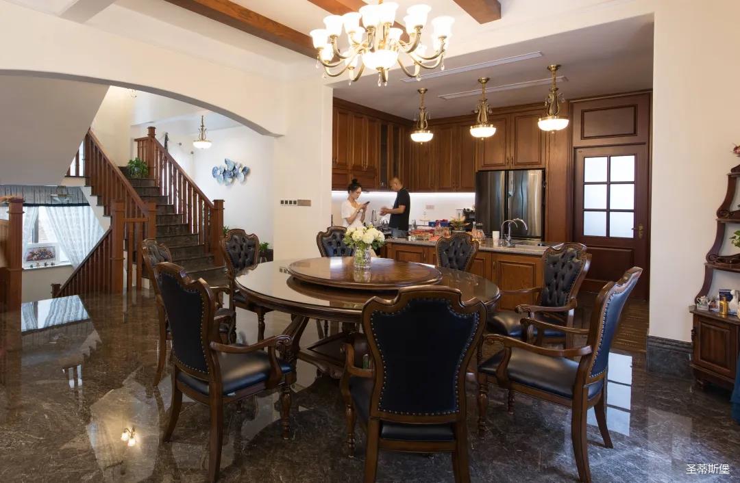 玄關(guān)進(jìn)入轉(zhuǎn)角處,以穩(wěn)重大氣實(shí)木為主色調(diào)的開(kāi)放式中西餐廚空間,將一體化無(wú)隔斷設(shè)計(jì)貫徹到每個(gè)細(xì)節(jié),采用了親膚真皮質(zhì)感的餐椅,手工雕刻的曲線讓原本硬朗的空間變得格外優(yōu)雅,自上而下,構(gòu)成完整的美式空間氣度,在每天的生活點(diǎn)滴間,沉浸在美式風(fēng)情中,更加隨性舒適。