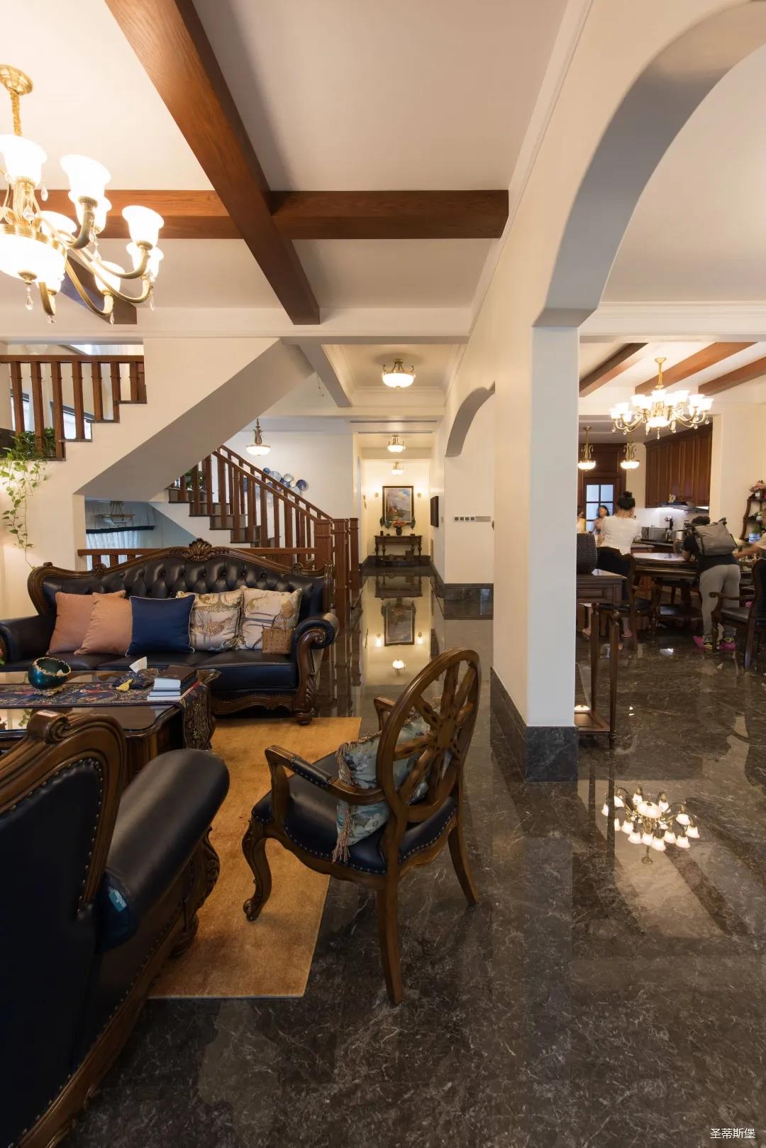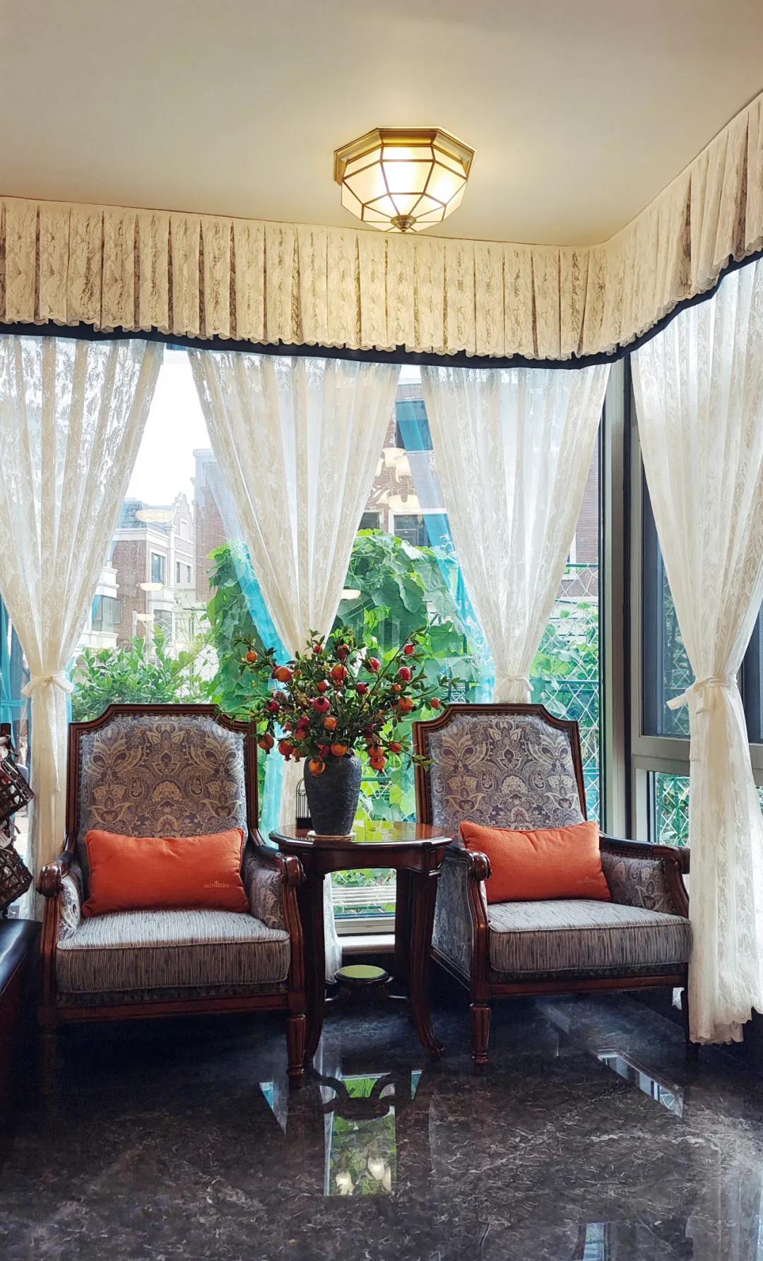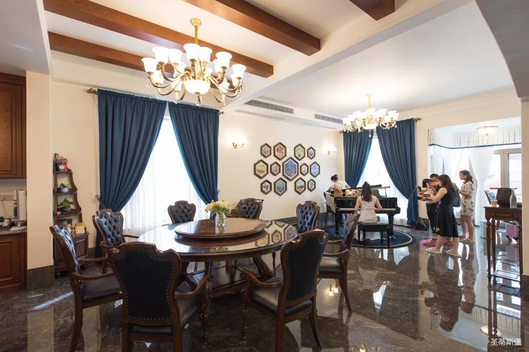 業(yè)主喜歡沉穩(wěn)的美式新古典風(fēng)格,整體統(tǒng)一的色調(diào),呈現(xiàn)了一種莊重的典雅感。醇厚的實(shí)木真皮沙發(fā),以古典的手法描繪出一種略帶復(fù)古的時(shí)尚奢華。一抹深藍(lán)迂回婉轉(zhuǎn)映照著空間的色系,明暗相對(duì),符合著現(xiàn)代審美,卻又不顯沉悶。轉(zhuǎn)角處的一臺(tái)復(fù)古唱片機(jī),還原了對(duì)音樂(lè)傾心的浪漫,抬起撥桿將唱針落下,隨著唱片的轉(zhuǎn)動(dòng)和音樂(lè)的響起,美好的一天就此開(kāi)始。