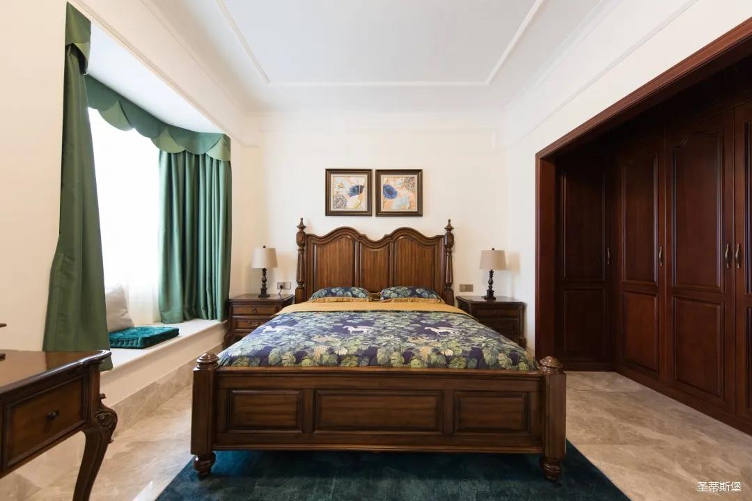 三樓是兩間臥房,每一間臥室都有自己的特定屬性。主人房端莊優(yōu)雅,雍容盡顯;墻面以簡(jiǎn)潔的美式石膏線修飾,波浪形的實(shí)木床屏上點(diǎn)綴著太陽(yáng)形狀的手工雕花,宛如海平面上剛出升的太陽(yáng),讓整個(gè)空間色彩奔放。
