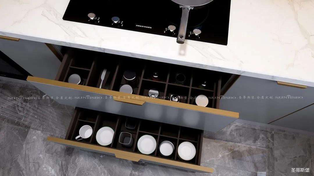 廚房是獨(dú)屬我的一片小天地,設(shè)計(jì)師充分利用了材質(zhì)特性,定制高柜,根據(jù)我的用廚習(xí)慣進(jìn)行收納區(qū)域劃分,極簡(jiǎn)大氣的外部結(jié)構(gòu)實(shí)則蘊(yùn)藏著超乎想象的大收納空間。