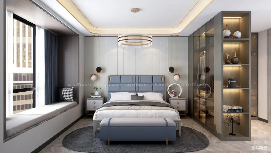 臥室的設(shè)計(jì)繼續(xù)延續(xù)著空間的高級(jí)灰,藍(lán)灰色彩的對(duì)比,讓主臥空間層次感更加豐富,充足的陽(yáng)光隨意散落,空間更加溫暖大氣,對(duì)稱的球形吊燈設(shè)計(jì),恍如兩個(gè)“快樂(lè)星球”,展現(xiàn)著空間應(yīng)有的藝術(shù)性,設(shè)計(jì)師巧妙地設(shè)計(jì),營(yíng)造出與眾不同的生活品質(zhì)。