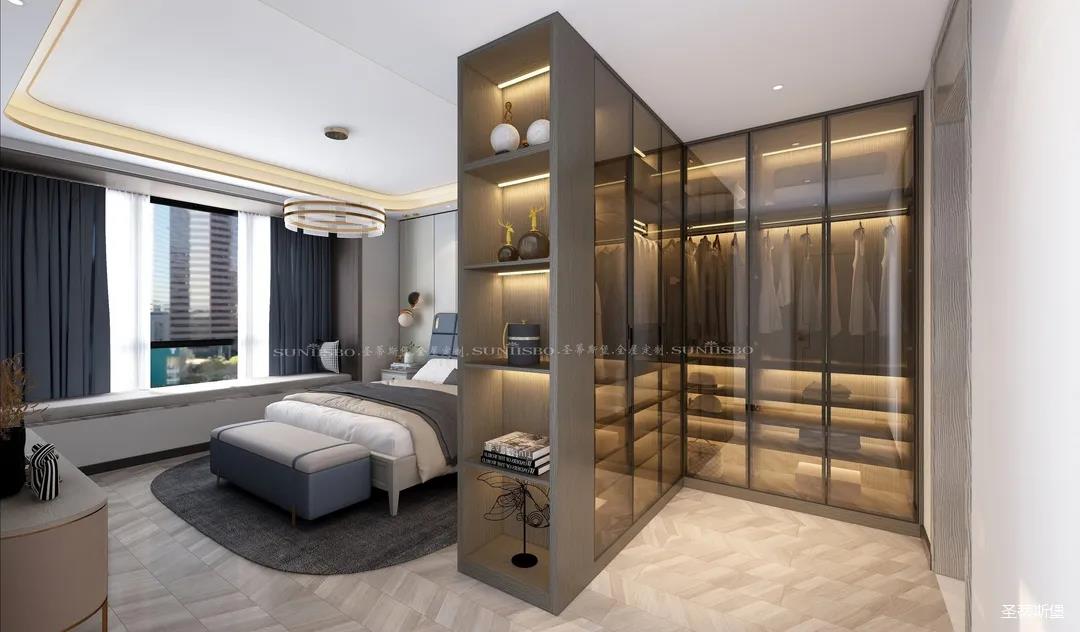 設(shè)計(jì)師不浪費(fèi)每一寸空間,將主臥的大空間劃分出一個(gè)步入式的L型衣帽間,當(dāng)即隔斷了進(jìn)門對(duì)床的尷尬,滿足了我一直以來(lái)?yè)碛歇?dú)立衣帽間的夢(mèng)想,它不僅是個(gè)收納場(chǎng)所,更是臥室的質(zhì)感體現(xiàn)。
