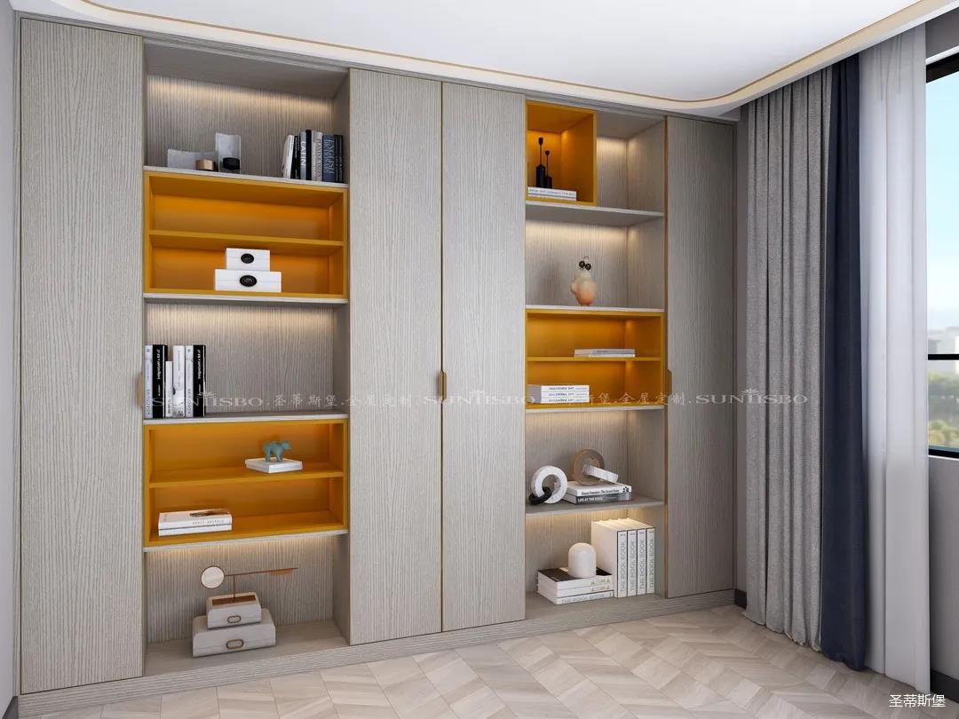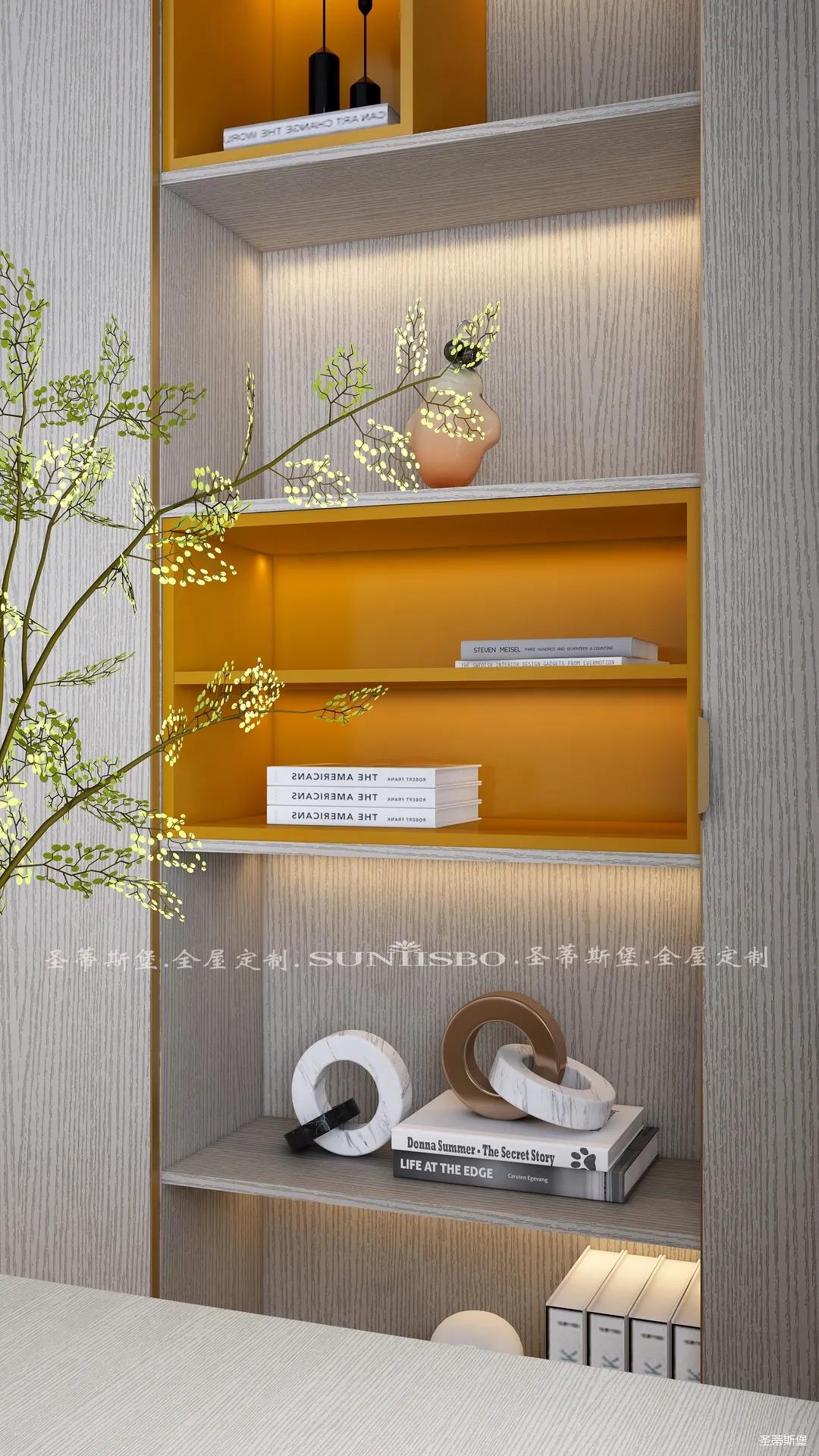 書柜點(diǎn)綴著適當(dāng)?shù)膼?ài)馬仕橙,除了自身攜帶的高貴氣質(zhì),在聚焦視線的同時(shí),還明確了收納分區(qū)。