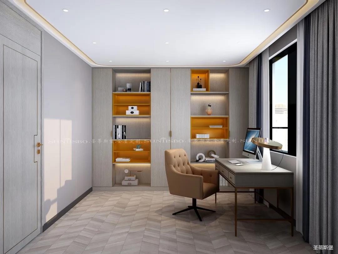 英倫仿古灰實(shí)木嵌墻書柜,結(jié)合同色系的時(shí)尚簡(jiǎn)約書桌,整個(gè)空間都被自然氣息包圍。由于工作原因,加班也成為了生活中的常態(tài),簡(jiǎn)約書房設(shè)計(jì)打破了平時(shí)忙碌的生活,也為心中尋得那一方心靜之地。