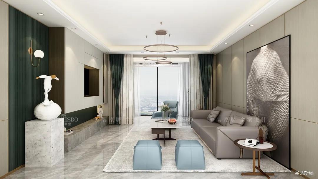 客廳色彩搭配極為巧妙,淺色木飾面與深綠木欄柵搭配讓空間高級感隨即上升,墻面的虛實(shí)裝飾畫作為點(diǎn)睛之筆,讓看似空曠簡單的沙發(fā)背景墻多了份藝術(shù)氣息。