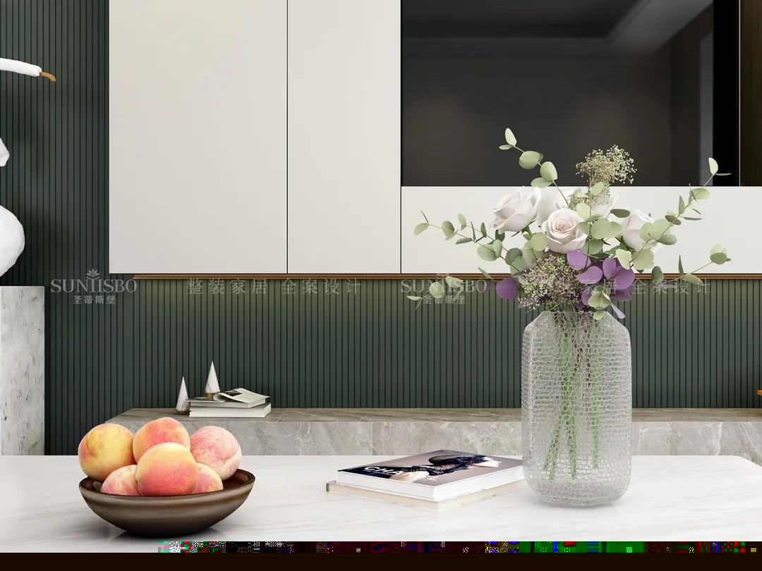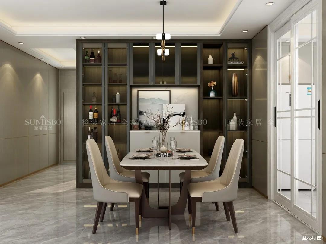 餐廳全開放式的布局,遵循了家具收納的28原則,20%的封閉式儲納,收納不常用的雜亂物品,80%的半開放設(shè)計(jì),展示軟裝飾物。餐邊柜將玻璃、金屬、實(shí)木材質(zhì)糅合分配,讓空間質(zhì)感倍增的同時(shí),也讓用餐空間多了一份家的溫度。