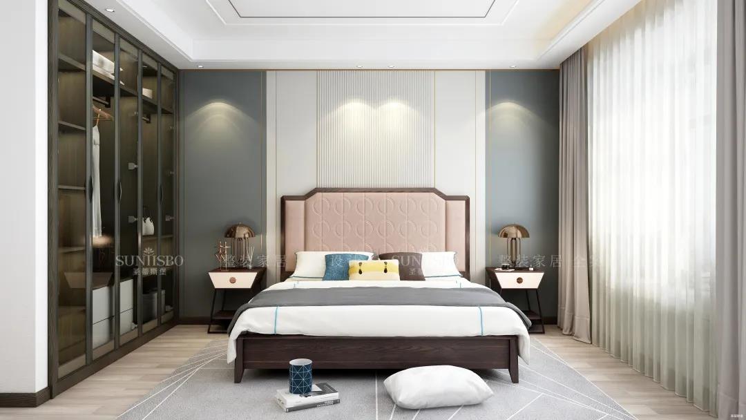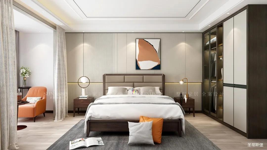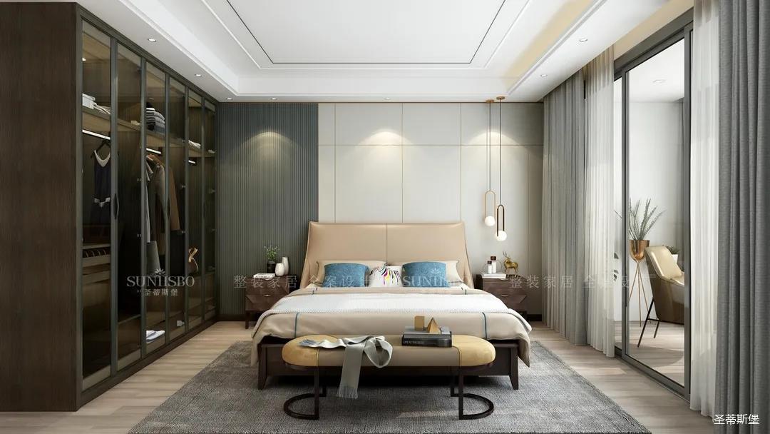 主臥運(yùn)用了大面積落地窗圍合,整體的無主燈設(shè)計(jì),凸顯了空間極簡潮流。無限引入窗外的移動光線,輕松為空間注入陽光的溫度,u型極簡金屬懸置著一個(gè)白色造型燈,讓空間從靜謐中生出無窮的變幻。家具設(shè)計(jì)偏向簡約舒適,造型雖不奪目,但細(xì)節(jié)質(zhì)感卻能經(jīng)得起時(shí)光的琢磨與品味。