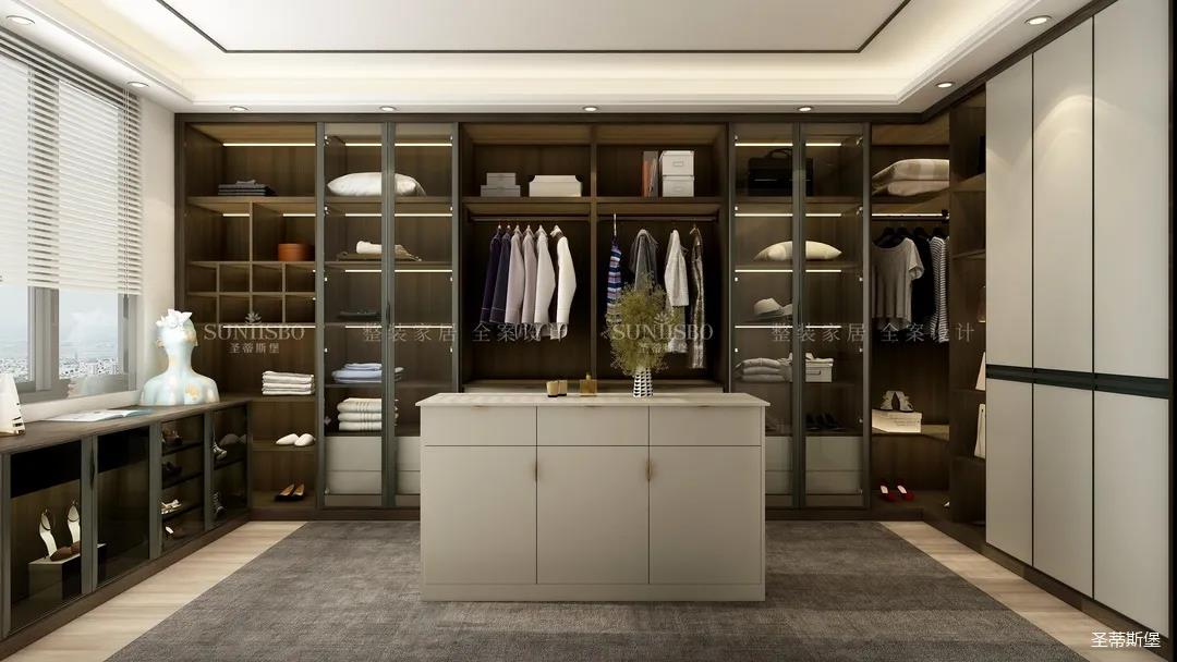 衣帽間采用了虛實(shí)結(jié)合的設(shè)計(jì),構(gòu)筑起規(guī)整而有序的置物區(qū)域和功能齊全的收納系統(tǒng),煙熏色實(shí)木作為空間的主要元素,環(huán)抱著整個(gè)衣帽間,張揚(yáng)又不失沉穩(wěn),恰到好處地搭配金屬玻璃置頂高門和感應(yīng)燈光系統(tǒng),挑高了空間效果,也詮釋著現(xiàn)代極簡線條美感和對極致的生活追求。