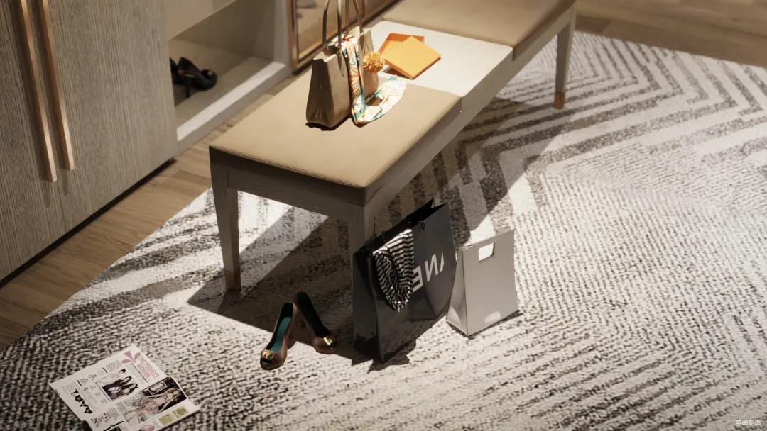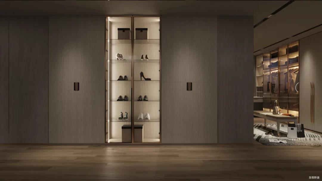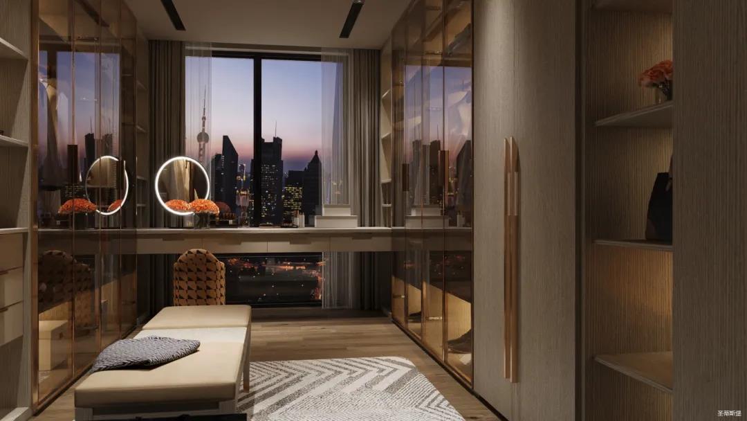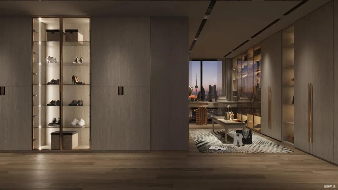 移步衣帽間,精簡華麗幾乎貫穿了整個(gè)空間,質(zhì)感高級(jí)的實(shí)木定制柜框架、通透明亮的玻璃展示區(qū)、色調(diào)醇厚的金屬鑲邊,每一項(xiàng)細(xì)節(jié)搭配都在強(qiáng)調(diào)著業(yè)主的高端品位。妝臺(tái)前的落地窗讓我們?cè)谟^賞都市繁華的同時(shí)也屏蔽了都市喧囂,讓我們置身于繁華都市中有一處寧靜休憩地。