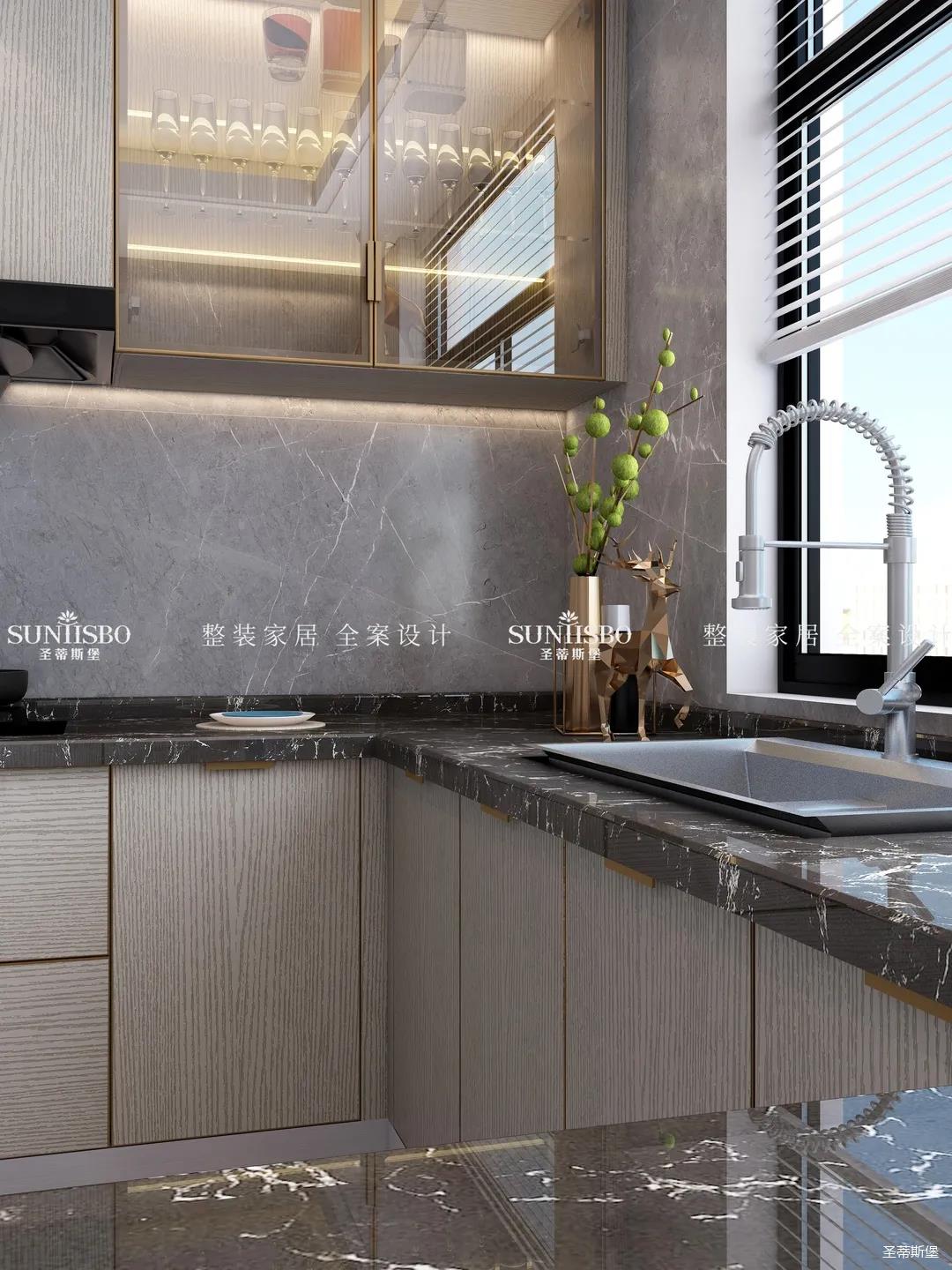 打通廚房與客廳空間,新增西廚區(qū)域,滿足業(yè)主最大程度的生活交流;
