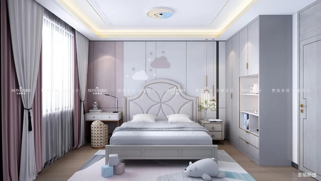 兒童房以粉白為基調(diào),醞釀著世間充滿童真和浪漫的語(yǔ)言。四照花型的床屏,讓人聯(lián)想到被粉色鮮花包圍的公主王國(guó)。封閉式的收納衣柜增加了開放式的兒童玩偶展示區(qū),溫馨又浪漫,讓小孩在童話王國(guó)里長(zhǎng)大。