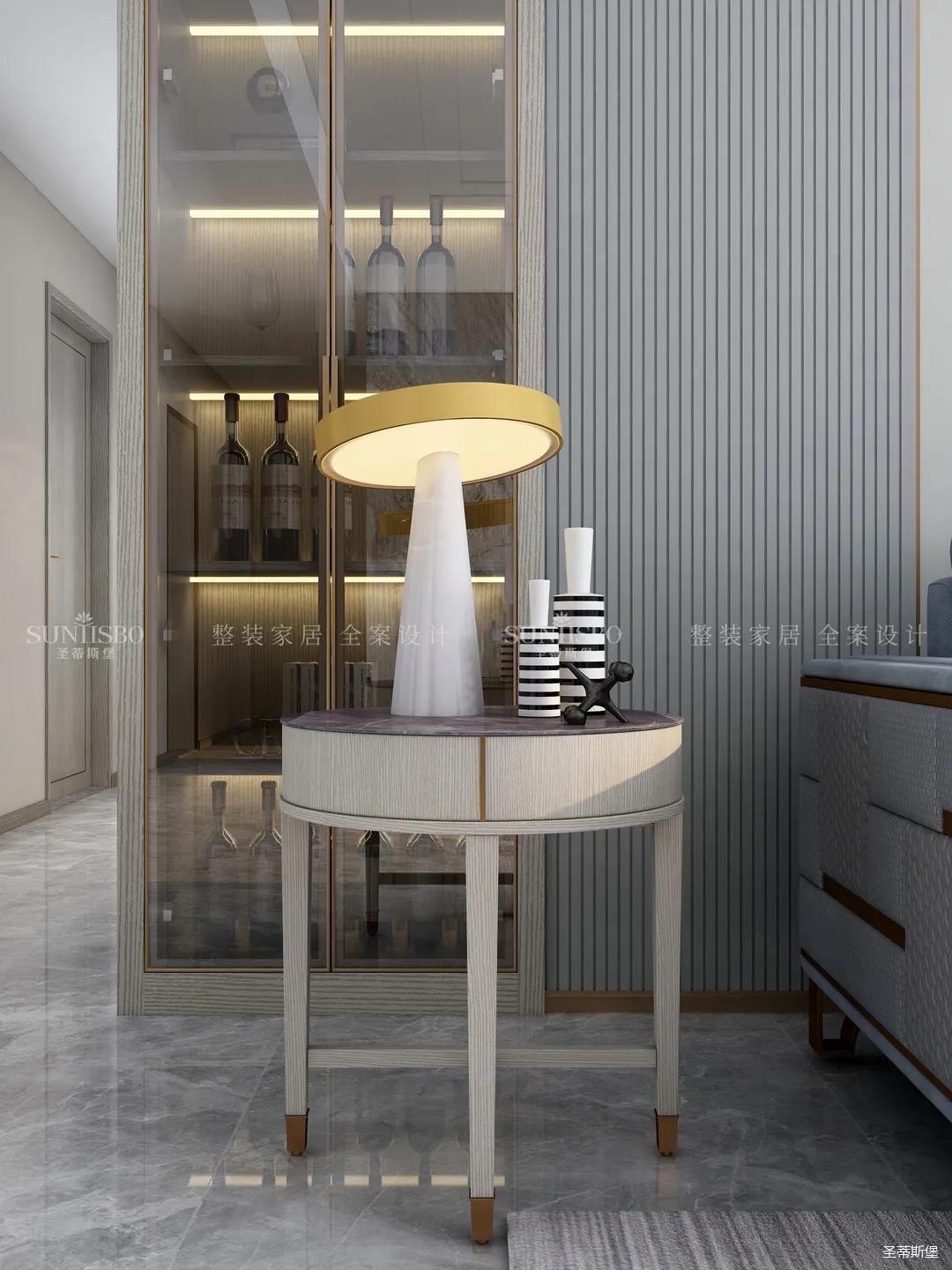 精細(xì)結(jié)構(gòu)下沙發(fā)角幾的微金屬結(jié)構(gòu),干凈利落,彰顯質(zhì)感。整面大理石背景墻將電視設(shè)計為壁龕結(jié)構(gòu),底部的裝飾壁爐讓家的溫馨感再度升級。